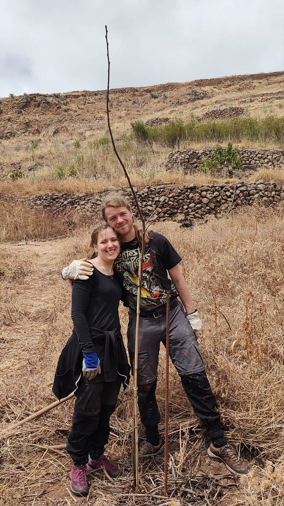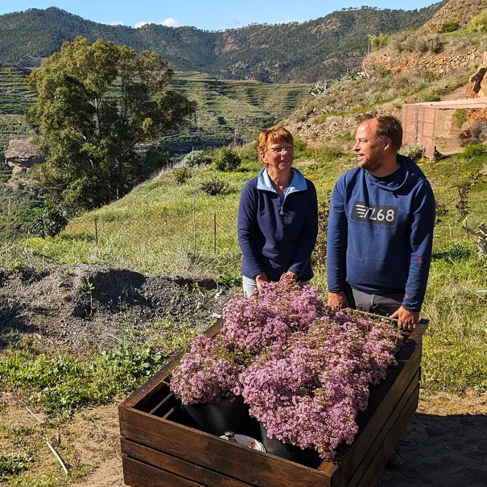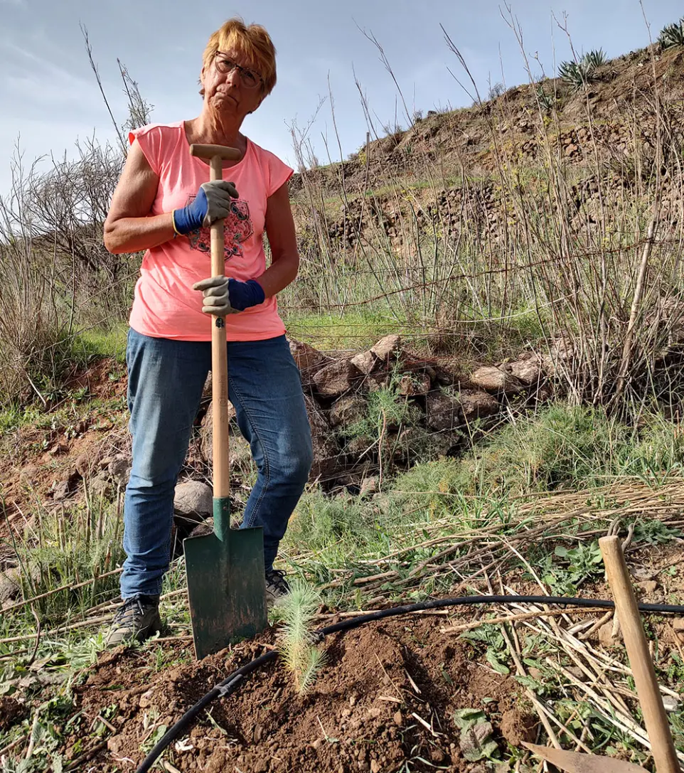 We are growing a food forest on a somewhat barren mountain top on Gran Canaria because we want to create a dynamic, sustainable and ecological food production system that contributes to the biodiversity on the island. Avoiding conventional agriculture, we will use local natural resources with respect. Through reforestation, we shall return our mountain top to its natural state. Centuries ago it was overgrown by local Canary pines. We have already planted 30 of them in 2022. At the same time we will return water to the land, plant fruit, nut and pod trees, shrubs, herbs and much more. This way we will be nurturing the young forest until it is old enough to guide us.
